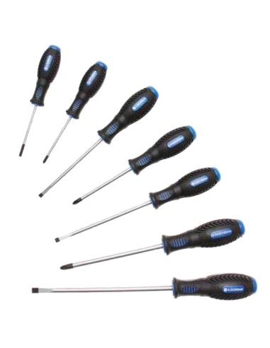 Mango antideslizante de 2 componentes. Destornilladores planos: 4 x 80 mm - 5,5 x 125 mm - 6,5 x 150 mm - 8,0 x 200 mm. Destornilladores de cruz PH: PH1 x 80 mm - PH2 x 100 mm - PH3 x 150 mm. Material acero al cromo molibdeno. Peso bruto 882 g.