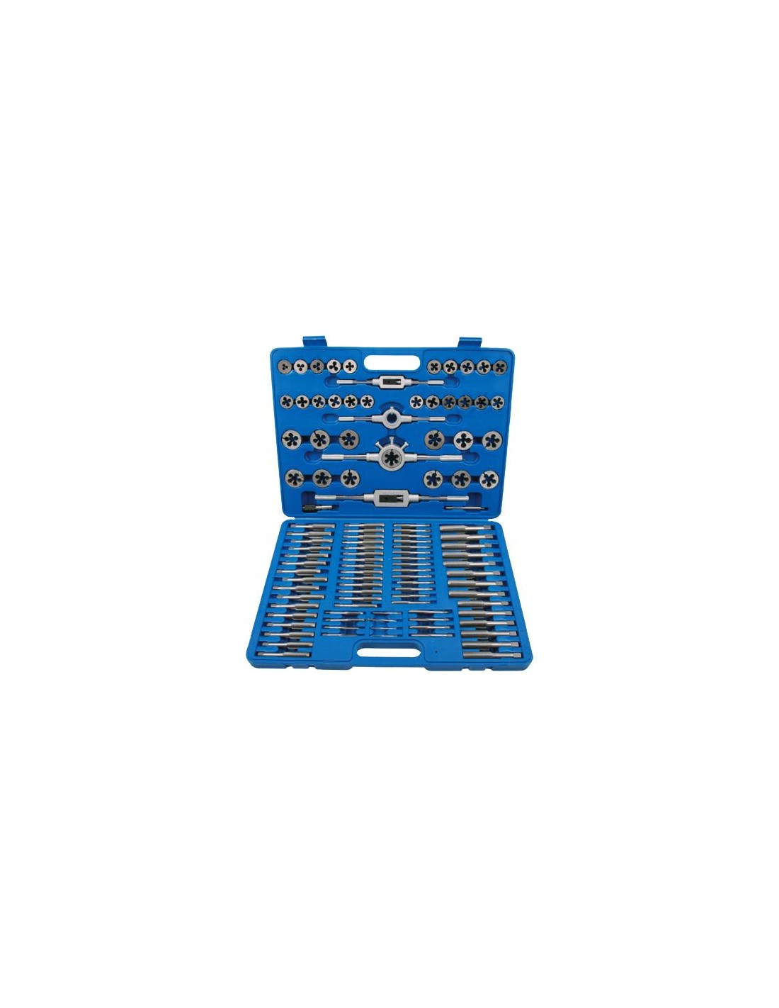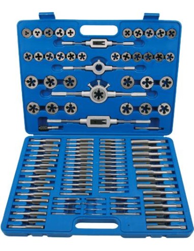 Especial para rosca fina. 2 soporte de terraja. 2 soporte para machos. 1 soporte en T para machos. Respectivamente 35 machos para desbaste y corte principal, machos de acabado y terrajas en las siguientes medidas y pasos: M2 x 0.4 - M3 x 0.5 - M4 x 0.7 - M5 x 0.8 - M6 x 1.0 - M6 x 0.75 - M7 x 1.0 - M7 x 0.75 - M8 x 0.75 - M8 x 1.0 - M8 x 1.25 - M9 x 0.75 - M9 x 1.0 - M9 x 1.25 - M10 x 0.75 - M10 x 1.0 - M10 x 1.25 - M10 x 1.5 - M11 x 0.75 - M11 x 1.0 - M11 x 1.25 - M11 x 1.5 - M12 x 0.75 - M12 x 1.0 - M12 x 1.25 - M12 x 1.5 - M12 x 1.75 - M14 x 1.0 - M14 x 1.25 - M14 x 1.5 - M14 x 2.0 - M16 x 1.0 - M16 x 1.5 - M16 x 2.0 - M18 x 1.5. Maleta de transporte de plástico. Peso bruto 6194 g. Material Acero para herramientas (GCr15)
