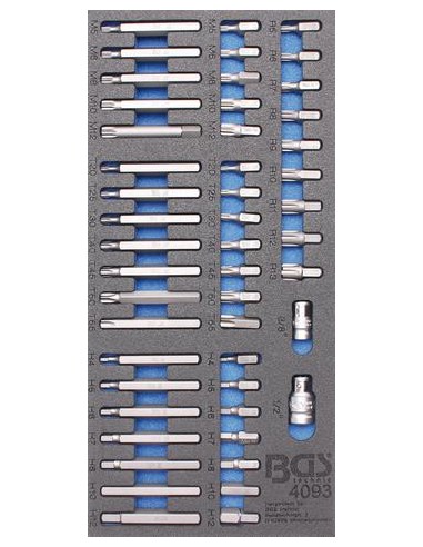 14 x puntas, cortas y largas, entrada 10 mm (3/8"), perfil en T (para Torx): T20 - T25 - T30 - T40 - T45 - T50 - T55