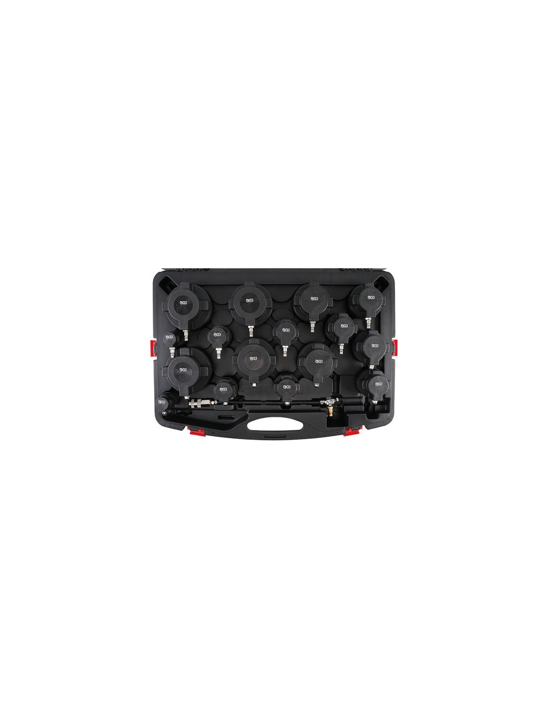 Adecuado para automóviles y utilitarios con motores Turbo, diesel y gasolina. Para comprobar los componentes del sistema de carga estando instalados. Detecta de manera rápida y profesional fugas en el intercooler aire-aire y en las mangueras del sistema de carga. También para comprobar fugas en válvulas de re circulación de gases de escape (AGR / EGR). Puede localizarse fácilmente una pérdida de presión notándola con la mano o con un aerosol para detección de fugas. Puede usarse en combinación con infladores neumáticos estándar, la pérdida de presión. Puede determinarse con ayuda del manómetro del aparato de inflado de neumáticos adecuado para diámetro interior de manguera 31,0 - 110,0 mm. Adaptador de cierre y de aire comprimido en dos escalones, para mangueras sin cierre de bayoneta. Válvula de seguridad de sobre presión integrada, se abre a 1,8 bar. Peso bruto 6898 g.