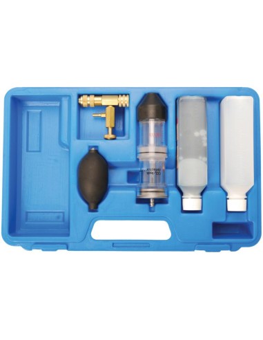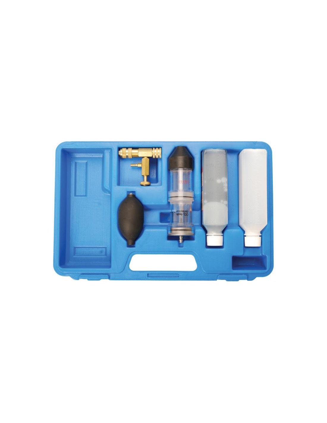 Para detectar las fugas más pequeñas, como por ej. juntas de culata con fugas, fisuras en el bloque del motor, etc. Adecuado para motores de gasolina, diésel y gas. Permite la detección de pequeñas cantidades de dióxido de carbono en el agua de refrigeración mediante la decoloración del líquido de ensayo (azul - verde - amarillo). Permite un diagnóstico preciso y sencillo. Una vez utilizado el líquido de ensayo, se puede volver a utilizar para otras pruebas. Recipiente de ensayo con adaptador cónico. Líquido de ensayo 250 ml. Botella vacía. Adaptador de acoplamiento rápido para conexión directa al adaptador de radiador de BGS 8027, 8098. Peso bruto 1395 g.