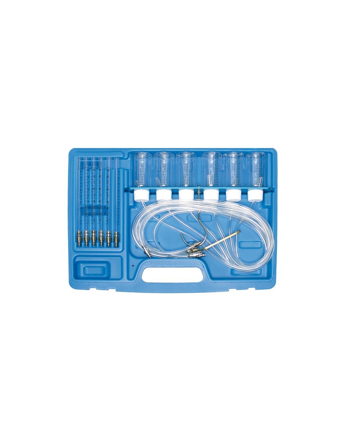 Determinación del volumen de retroceso mediante tubos de vidrio o recipientes de medición. Contiene 6 tubos de vidrio, 6 vasos medidores c/u con manguera de conexión de 70 cm, montados sobre una regleta de aluminio con gancho. Apto para diversas marcas de inyectores. Peso bruto 1520 g.