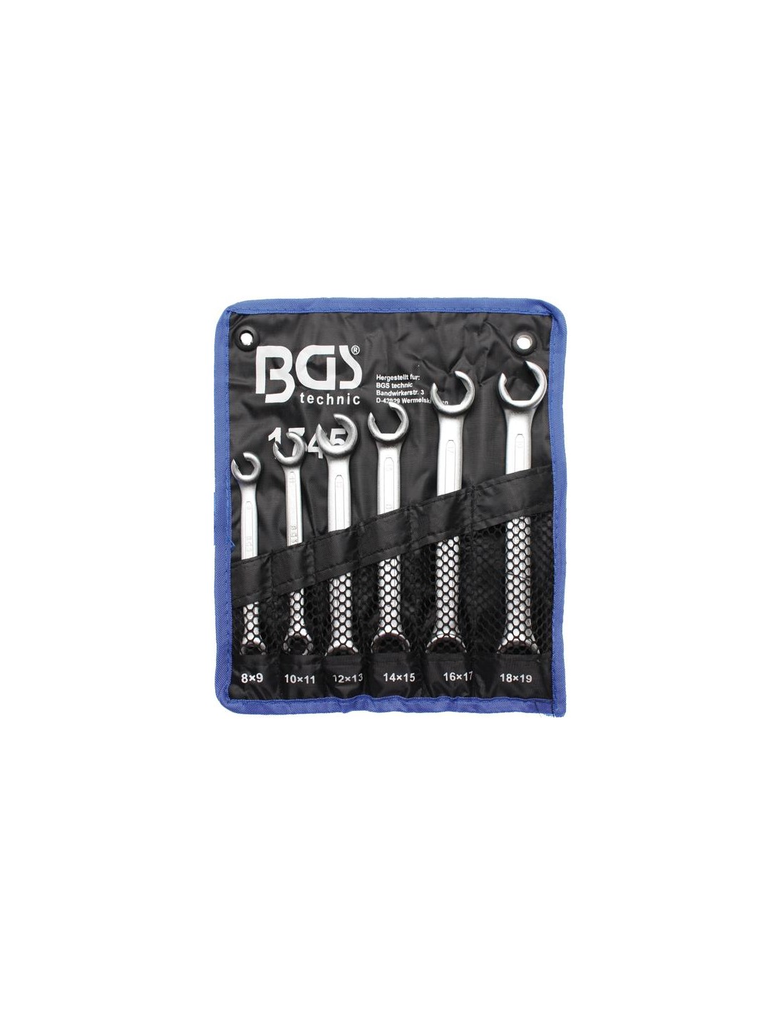 Forjado en frío. Cromado mate. Extremos abiertos en ángulo 15°. Peso bruto 718 g. Material Acero al cromo vanadio.