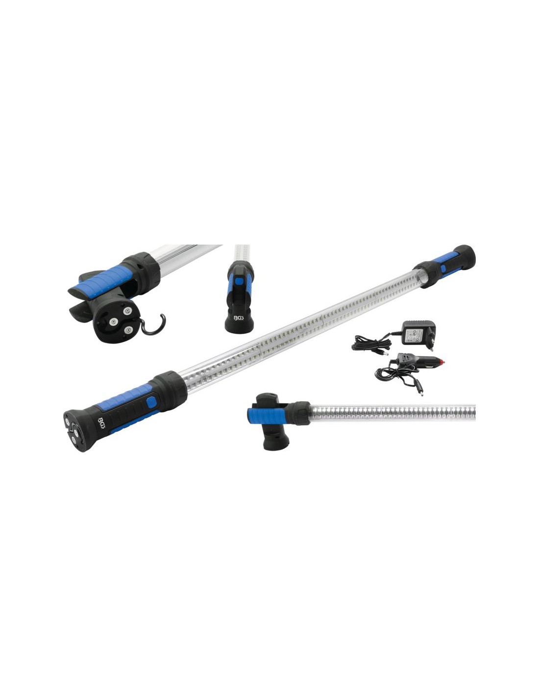 Iluminación del compartimento del motor con 120 LED SMD, conmutable a 60 LED SMD. Se puede utilizar horizontal o verticalmente. Pie (en ambos lados), 200° inclinable y 30° giratorio. 3 imanes por lado. Gancho (en ambos lados), 360 grados giratorio. Interruptor de encendido/apagado (en ambos lados)120 SMD-LED. Brillo: 800 lm. Tiempo de carga: aprox. 6 horas. Peso total 780 g (con el cargador) / 680 g (sin cargador).