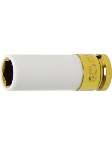 Apto para uso manual y con pistolas de impacto. Con adaptador para pasador de bloqueo y anillo de goma. Con cobertura e inserción de plástico para protección de las llantas de aluminio. Vaso codificado por color. Cobertura plástica de repuesto disponible como BGS 7205. Perfil de transmisión Cuadrado interno. Tamaño del perfil de accionamiento 1, sistema métrico 12,5 mm. Tamaño del perfil de accionamiento, sistema anglosajón 1/2". Entrecaras 19 mm. Material Acero al cromo molibdeno Longitud 85 mm. Peso bruto 242 g. Torque máx. 637 Nm.