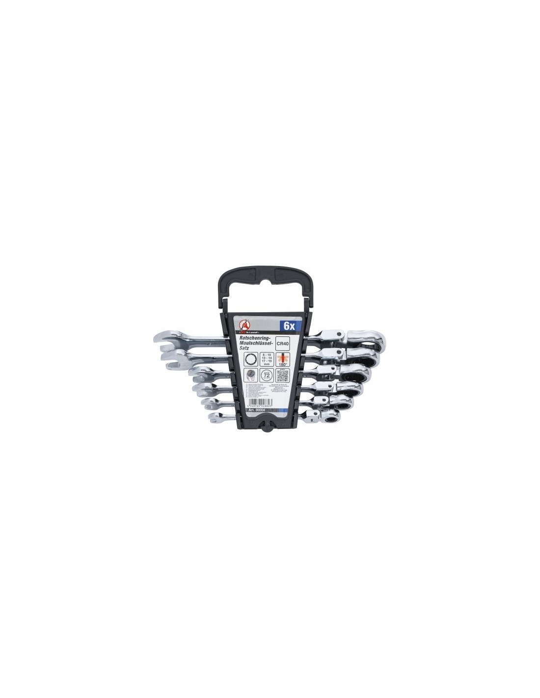 Función carraca con 72 dientes. Ángulo de ajuste extra pequeño 5°. Carraca articulada 180°. Contenido de suministro Llave combinadas con carraca 8 mm. Llave combinadas con carraca 10 mm. Llave combinadas con carraca 13 mm. Llave combinadas con carraca 14 mm. Llave combinadas con carraca 17 mm. Llave combinadas con carraca 19 mm.