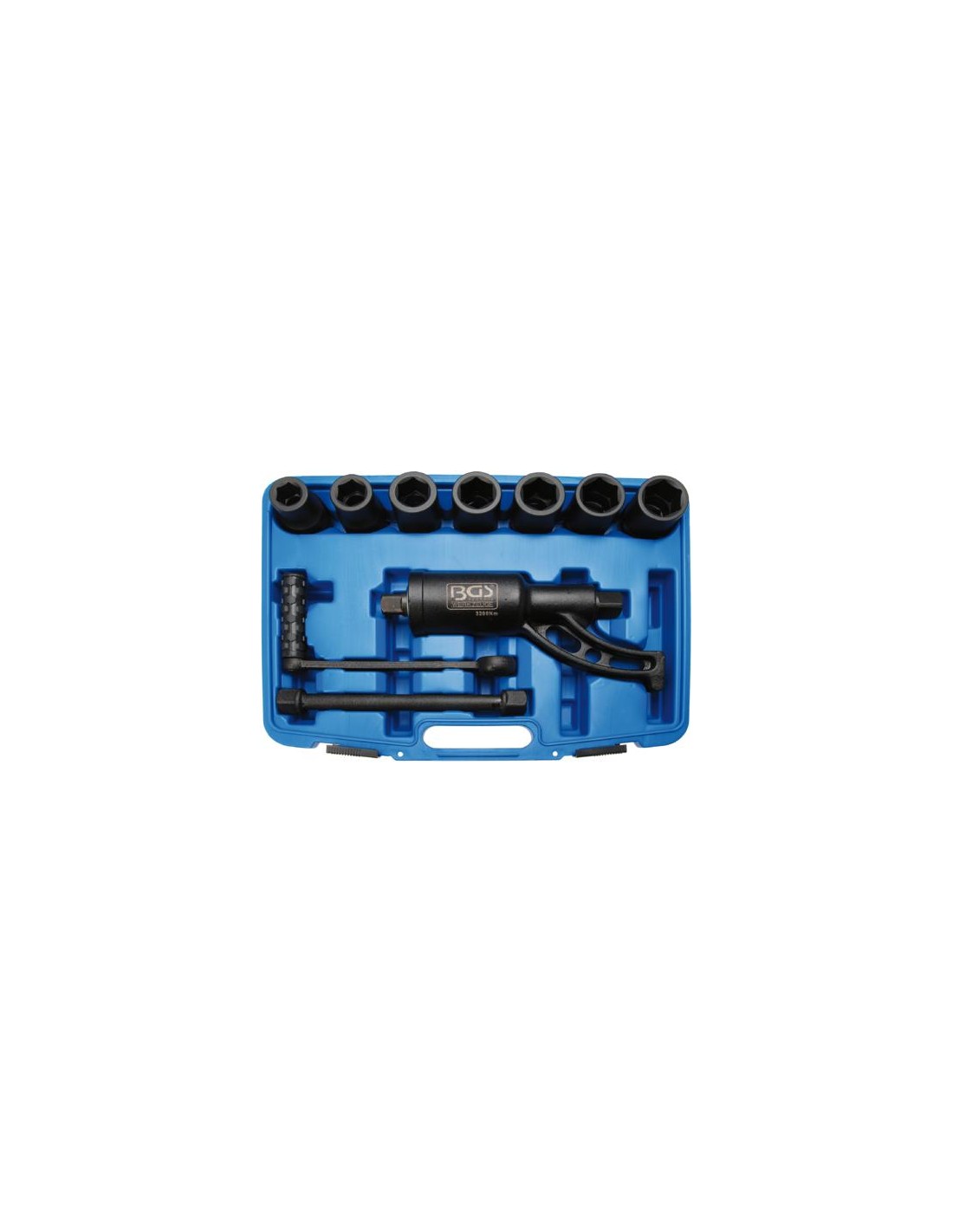 Para aflojar las tuercas de ruedas bloqueadas en camiones y furgonetas. Apriete máximo 3200 Nm. Relación de transmisión 1:56. Incluye 7 vasos de acero al cromo vanadio. Tamaños de los vasos 24 - 27 - 30 - 32 - 33 - 36 - 38 mm.