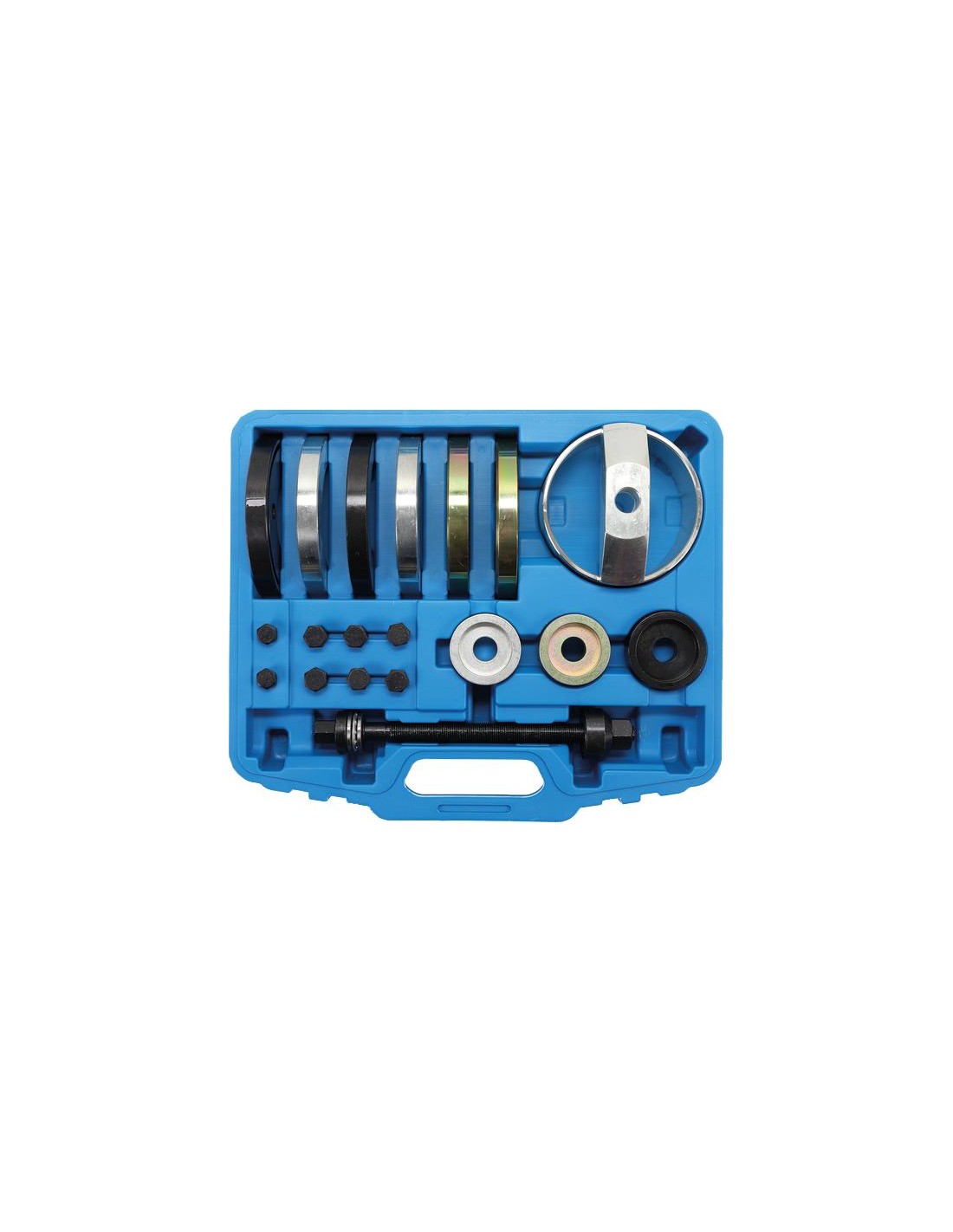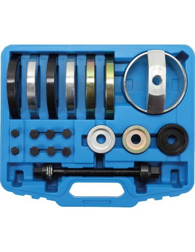 Adecuado para los siguientes modelos de VAG: Audi A2, VW Lupo / Polo / Fox, Seat Ibiza, Skoda Fabia. Se adapta a unidades de cojinete Ø 62, 66 y 72 mm. Permite un montaje directamente sobre el vehículo. Minimiza el tiempo de trabajo. Manejo sencillo y seguro. Puede ser utilizado opcionalmente con una prensa de taller. Peso bruto 12840 g.