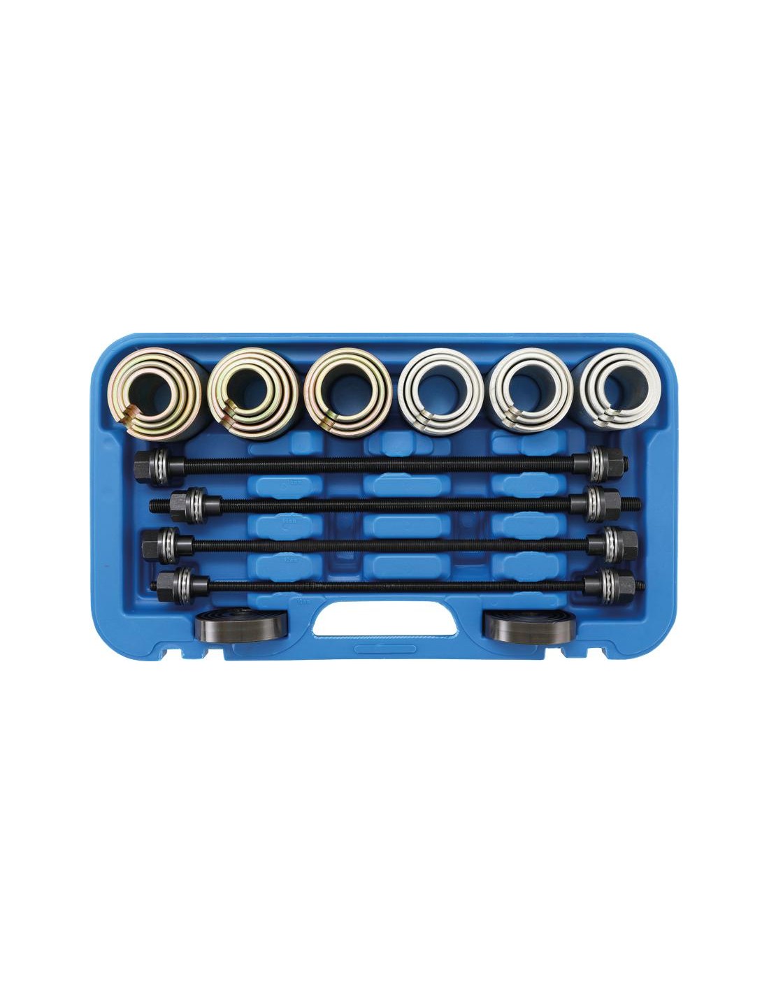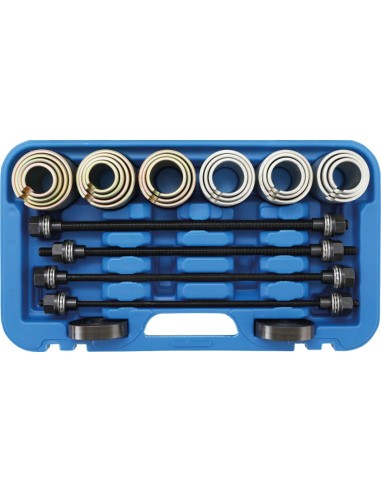 Juego completo para desmontar e instalar rápida y eficazmente rodamientos de las ruedas y bujes de suspensión. Reduce la posibilidad de dañar el cojinete y carcasas. Las placas de presión y los manguitos se pueden utilizar también en una prensa de taller. Peso bruto 18932 g.