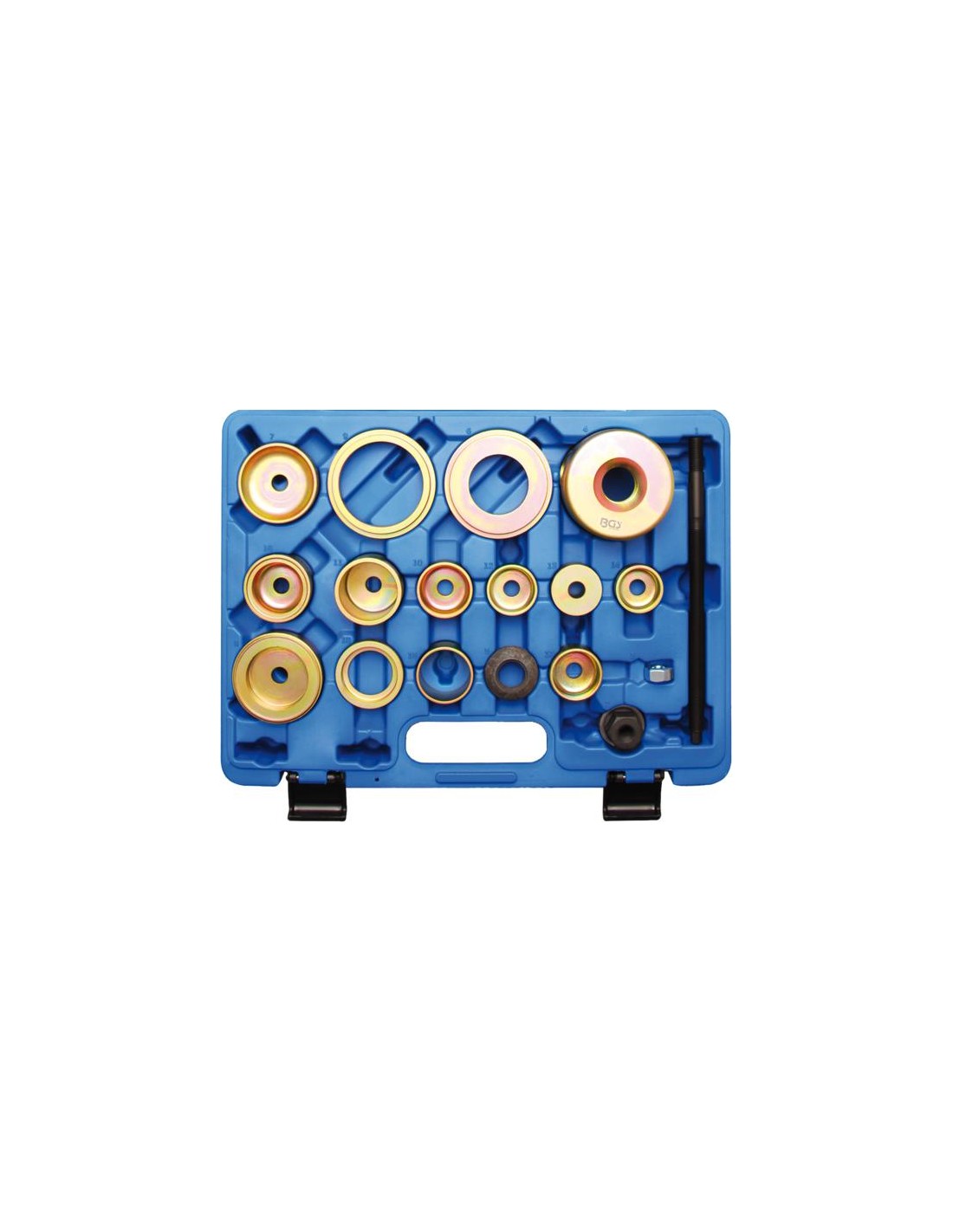 Para la sustitución de silentblocks en guías de ejes/brazos longitudinales, cajas de cojinetes de rueda, brazos transversales inferior/interior. Permite la renovación de silentblocks en el vehículo, estando instalados. Aplicable en conjunción con husillo mecánico. Adecuado para los siguientes vehículos VAG: VW: Golf 5 Plus / Variant / 4-Motion 2005-2012, Jetta / Syncro 2006-2012, Scirocco 2009-2012, Beetle desde 2012, Eos 2006-2012 Seat: Altea 2004-2012, Leon 2006-2012, Toledo 2005-2009 Audi: A3 / S3 2004-2012, TT / TTS Coupe/Roadster 2007-2012. Peso bruto 4878 g.