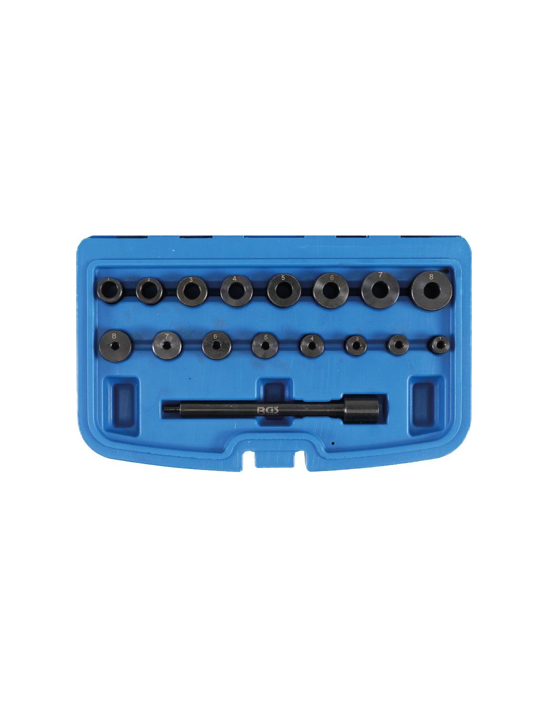 8 adaptador cónico de centrado para discos de embrague con orificio: 14,5 - 25,5 mm. 8 adaptador para el centrado en el cigüeñal: 10,8 - 12,2 - 13,5 - 14,7 - 15,8 - 17,1 - 18,3 - 19,9 mm. Eje de centrado 145 mm. Peso bruto 1330 g.