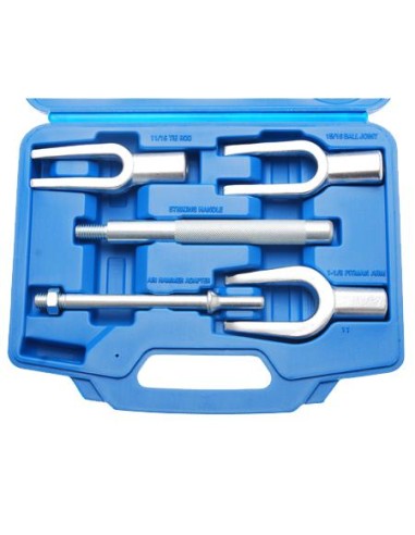 Con cabezales de horquilla intercambiable. Para la liberación rápida de los extremos de la barra de acoplamiento, palancas de dirección, etc. Aberturas de horquilla aprox.17,4 - 23,8 - 28,5 mm. Fabricados en acero para herramientas forjado, Adaptador para uso manual , Adaptador para uso con martillos neumáticos (10 mm). Material Acero para herramientas . Peso bruto 2060 g.